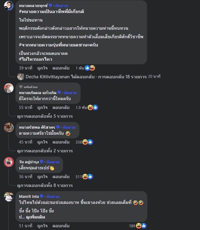 ขณะที่ ทนายรัชพล ศิริสาคร ร่วมแสดงความคิดเห็นว่า “ตามความศรัธาใช่มั้ยครับ” เป็นต้น