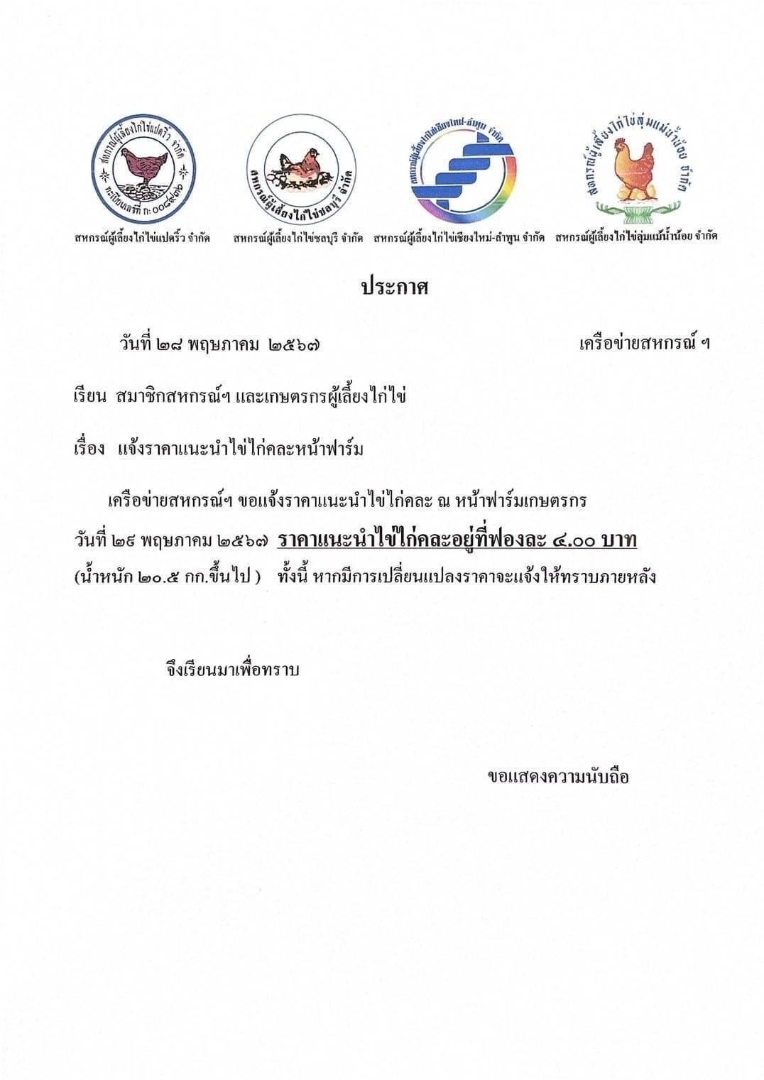28 พฤษภาคม ผู้สื่อข่าวรายงานว่า เครือข่ายสหกรณ์ผู้เลี้ยงไก่ไข่ ประกอบด้วย สหกรณ์ผู้เลี้ยงไก่ไข่แปดริ้ว จำกัด, สหกรณ์ผู้เลี้ยงไก่ไข่ชลบุรี จำกัด, สหกรณ์ผู้เลี้ยงไก่ไข่เชียงใหม่-ลำพูน จำกัด และสหกรณ์ผู้เลี้ยงไก่ไข่ลุ่มแม่น้ำน้อย จำกัด ได้ออกประกาศแจ้งสมาชิกสหกรณ์และเกษตรกรผู้เลี้ยงไก่ไข่ ปรับราคาไข่ไก่คละ ณ หน้าฟาร์มกษตรกร ขึ้นราคาอีกแผงละ 6 บาท หรือฟองละ 20 สตางค์ ตั้งแต่วันที่ 29 พฤษภาคม 2567 เป็นต้นไป หากมีการเปลี่ยนแปลงราคาจะแจ้งให้ทราบภายหลัง