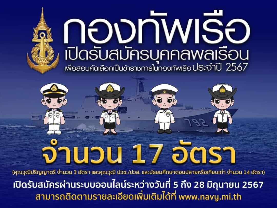 ประกาศคณะกรรมการสอบคัดเลือกบุคคลพลเรือนเพื่อบรรจุเข้ารับราชการในกองทัพเรือ เรื่อง การรับรับสมัครสอบคัดเลือกบุคคลพลเรือนเข้าเป็นข้าราชการใน กองทัพเรือ ประจำปี 2567