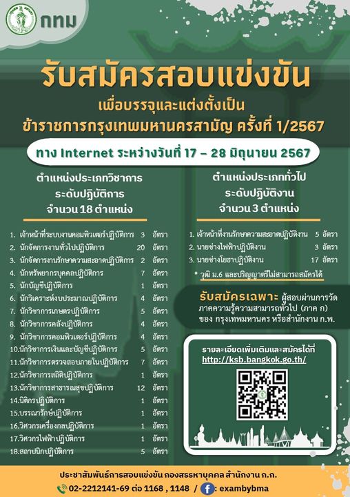 ประกาศสำนักงานคณะกรรมการข้าราชการกรุงเทพมหานคร รับสมัครสอบแข่งขันเพื่อบรรจุและแต่งตั้งบุคคลเข้ารับราชการเป็นข้าราชการกรุงเทพมหานครสามัญ ครั้งที่ 1/2567