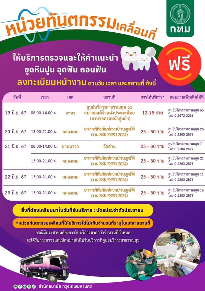 สำนักอนามัย กรุงเทพมหานคร แจ้งพิกัดหน่วยทันตกรรมเคลื่อนที่ให้บริการตรวจและให้คำแนะนำ ขูดหินปูน อุดฟัน ถอนฟัน ฟรี วอล์คอิน (Walk In) ลงทะเบียนหน้างานเพียงแค่แสดงบัตรประจำตัวประชาชนตามวัน เวลา และสถานที่ ดังนี้