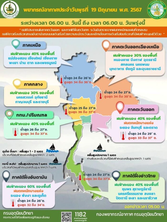 กรมอุตุนิยมวิทยา รายงานสภาพอากาศวันนี้ โดยระบุว่า พยากรณ์อากาศ 24 ชั่วโมงข้างหน้า มรสุมตะวันตกเฉียงใต้พัดปกคลุมทะเลอันดามัน ประเทศไทย และอ่าวไทย ประกอบกับมีหย่อมความกดอากาศต่ำปกคลุมบริเวณชายฝั่งประเทศเวียดนามตอนบนและอ่าวตังเกี๋ย ลักษณะเช่นนี้ทำให้ประเทศไทยมีฝนฟ้าคะนองเกิดขึ้นได้บางพื้นที่ และมีฝนตกหนักบางแห่งในภาคตะวันออก และภาคใต้ฝั่งตะวันตก ขอให้ประชาชนในบริเวณดังกล่าวระวังอันตรายจากฝนตกหนักและฝนที่ตกสะสม