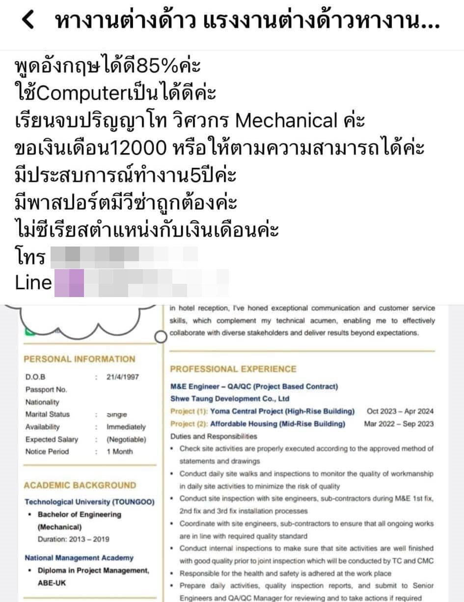 โลกออนไลน์ได้มีการแชร์ภาพจากเฟซบุ๊ก รักภาษาไทย อย่าใช้ผิด ที่มีการเปิดเผยเรซูเม่สมัครงานของหญิงสาวชาวเมียนมาคนหนึ่ง ที่โพสต์ไว้ในกลุ่มหางาน แรงงานต่างด้าว ซึ่งเธอสามารถใช้ภาษาไทย และภาษาอังกฤษได้ถึง 85% มีพาสสปอร์ต วีซ่า ถูกต้องตามกฎหมาย
