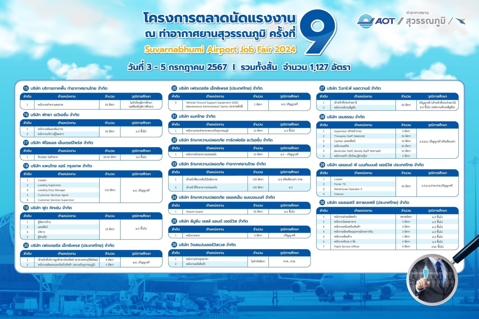 กับบริษัทผู้ประกอบการภายในท่าอากาศยาน โดยมีบริษัทชั้นนำกว่า 30 บริษัท อาทิ บริษัท รักษาความปลอดภัยท่าอากาศยานไทย จำกัด, บริษัท การบินกรุงเทพ จำกัด (มหาชน), บริษัท เอ แอนด์ พี เมนทิแนนซ์ เซอร์วิส ประเทศไทย จำกัด, บริษัท ลีมูซีน เซลล์ แอนด์ เซอร์วิส จำกัด, บริษัท วิงสแปน เซอร์วิสเซส จำกัด, บริษัท พัทยา เอวิเอชั่น สกายไอซีที จำกัด ฯลฯ มาร่วมออกบูธรับสมัครงาน