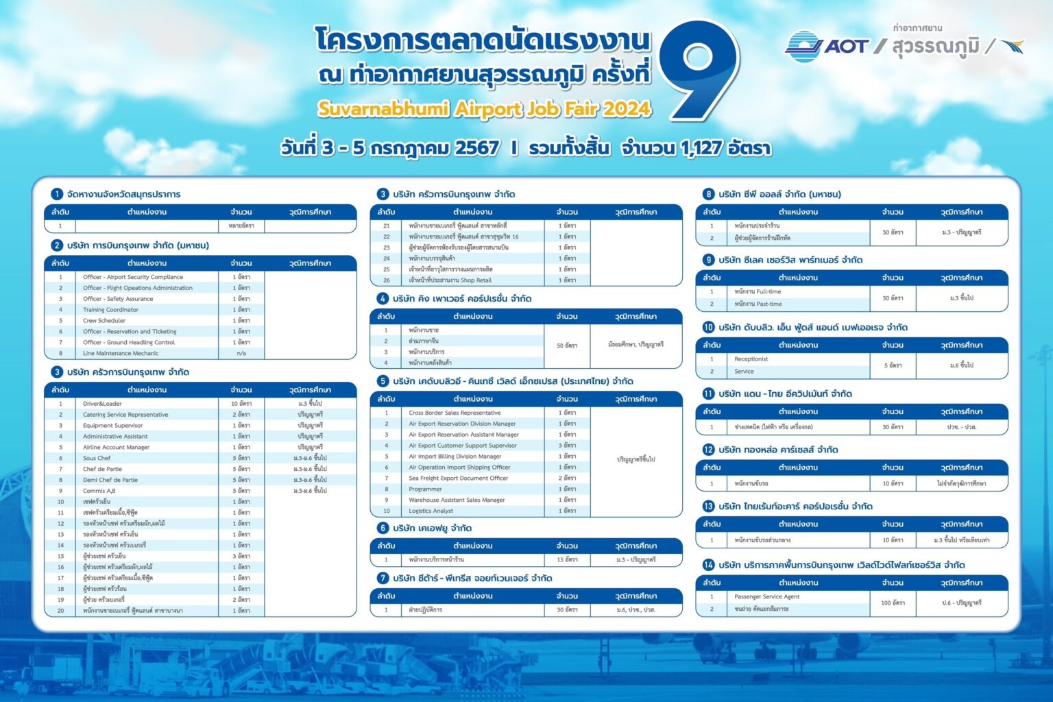 โดยเปิดรับตั้งแต่วุฒิการศึกษาระดับประถมศึกษาจนถึงปริญญาโท ในตำแหน่งต่างๆ เช่น วิศวกรไฟฟ้า พนักงานบริการลูกค้าภาคพื้น พนักงานคลังสินค้า พนักงานตรวจค้นสัมภาระผู้โดยสาร พนักงานขับรถ พนักงานรักษาความปลอดภัย ช่างเทคนิค เป็นต้น รวมแล้วกว่า 1,000 อัตรา นอกจากนี้ ยังได้รับความร่วมมือจากจัดหางานจังหวัดสมุทรปราการมาออกบูธแนะนำการใช้บริการหางานออนไลน์บนแพลตฟอร์มไทยมีงานทำ Doe.go.th ด้วย