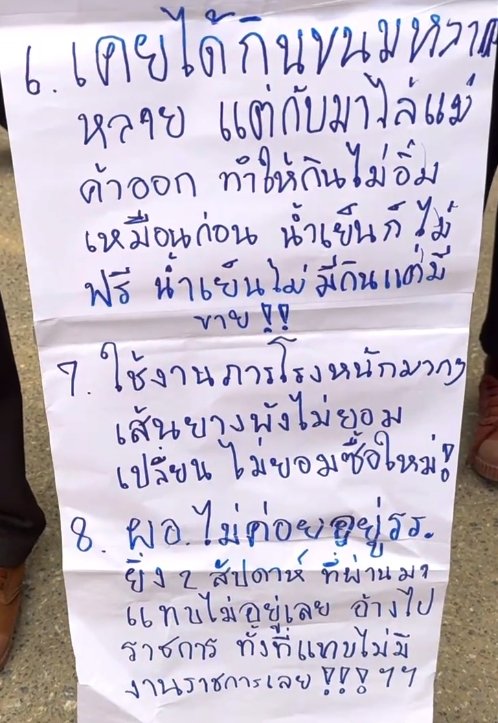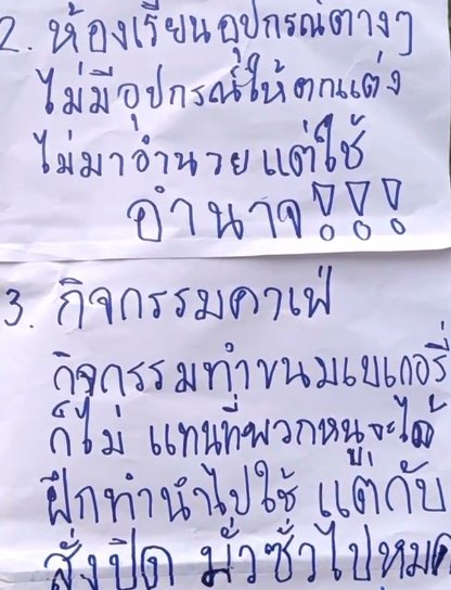 5.ไม้กวาดไม้ถูไม่มี แต่จะให้สะอาด ไม่สะอาดให้มาทำใหม่ กระทบการเรียน 6.เคยได้กินขนมหลากหลาย แต่กับมาไล่แม่ค้าออก ทำให้กินไม่อิ่มเหมือนก่อน น้ำเย็นก็ไม่ฟรี น้ำเย็นไม่มีกินแค่มีขาย 7.ใช้งานภารโรงหนักมากๆสายยางพังไม่ยอมเปลี่ยน ไม่ยอมซื้อใหม่ 8.ผอ.ไม่ค่อยอยู่โรงเรียน ยิ่ง 2 สัปดาห์ ที่ผ่านมาแทบไม่อยู่เลย อ้างไปราชการ ทั้งที่แทบไม่มีราชการเลย