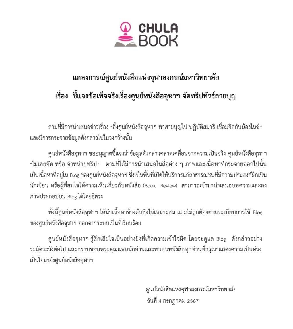 เมื่อวันที่ 4 กรกฎาคม ศูนย์หนังสือแห่งจุฬาลงกรณ์มหาวิทยาลัย ได้ออกแถลงการณ์ชี้แจงข้อเท็จจริงเรื่องศูนย์หนังสือจุฬาฯ จัดทริปทัวร์สายบุญ ความว่า ตามที่มีการนำเสนอข่าวเรื่อง “อึ้ง ศูนย์หนังสือจุฬาฯ พาสายบุญไป ปฏิบัติสมาธิ เชื่อมจิตกับน้องไนซ์” และมีการกระจายข้อมูลดังกล่าวไปในวงกว้างนั้น