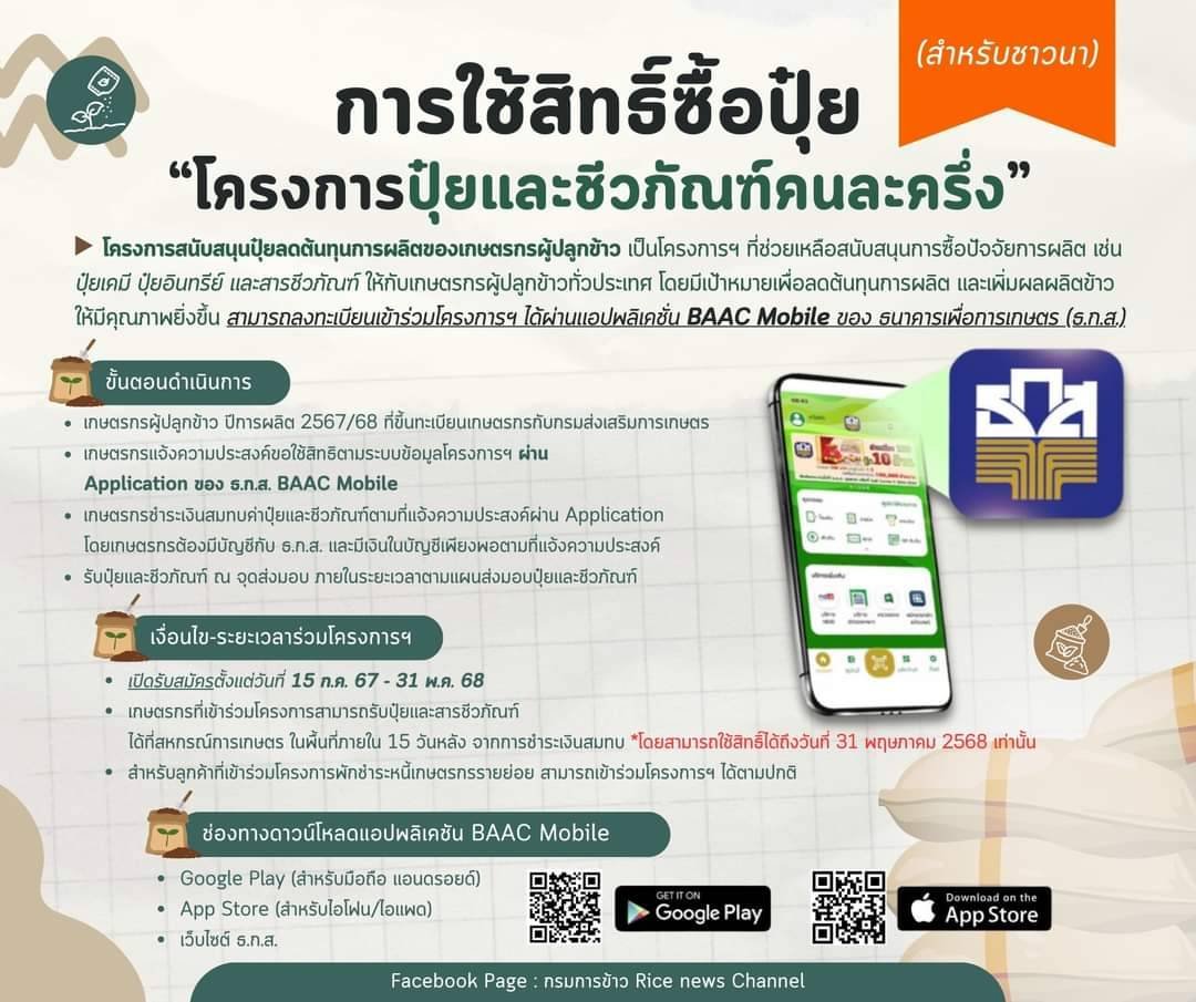 นายณัฏฐกิตติ์ ของทิพย์ อธิบดีกรมการข้าว ออกประกาศเมื่อวันที่ 5 กรกฎาคม 2567 เพื่อแจ้งให้ทราบว่า ขณะนี้กรมการข้าวออกประกาศรับสมัครผู้ประกอบกิจการปุ๋ยและชีวภัณฑ์ เข้าร่วมโครงการปุ๋ยคนละครึ่ง โดยเริ่มตั้งแต่วันที่ 8-10 กรกฎาคม 2567 โดยโครงการปุ๋ยคนละครึ่ง เป็นโครงการสนับสนุนปุ๋ยลดต้นทุนการผลิตของเกษตรกรผู้ปลูกข้าว ภายใต้มาตรการช่วยเหลือเกษตรกร ปีการผลิต 2567/68 มีเนื้อหาดังนี้