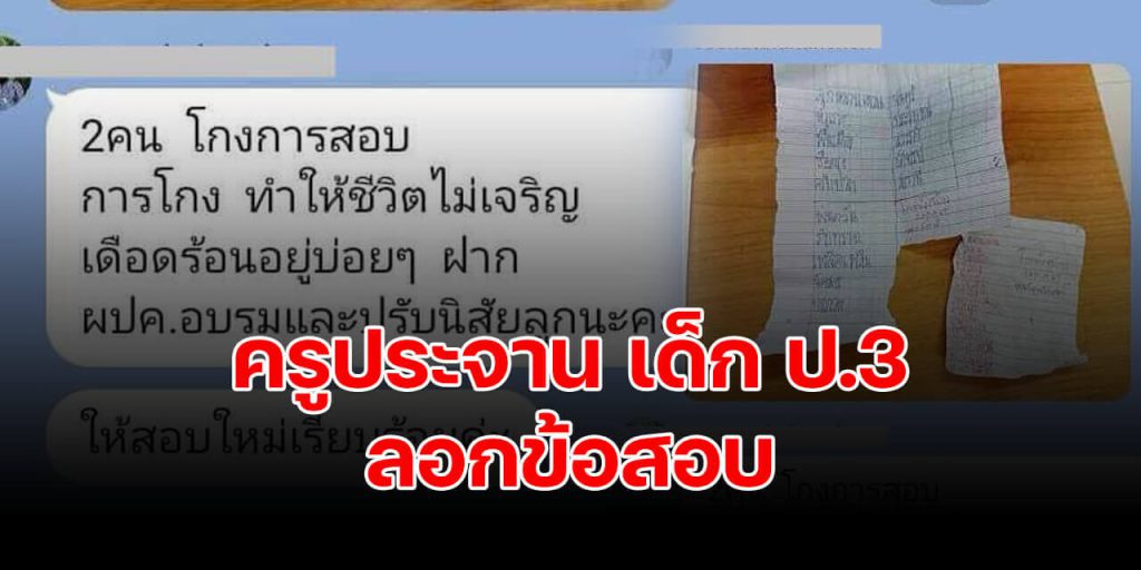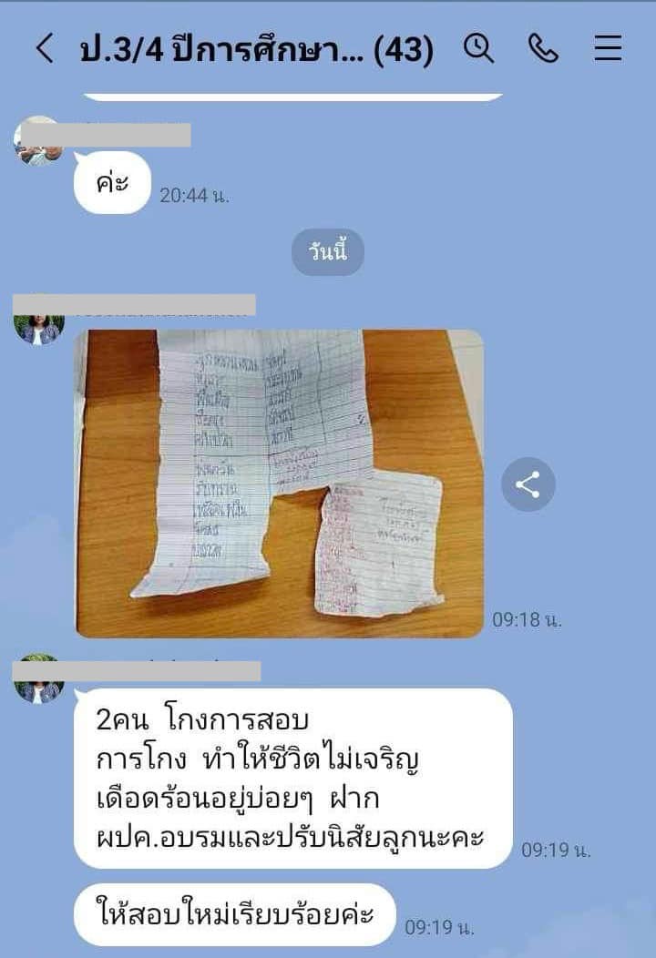 ซึ่งในแชทไลน์นี้ คุณครูได้มีการส่งภาพกระดาษ 1แผ่นที่มีการฉีกออกมา พร้อมกับข้อความของคุณครูท่นนนี้ โดยระบุว่า “2 คน โกงการสอบ การโกงทำให้ชีวิตไม่เจริญ เดือดร้อนอยู่บ่อยๆ ฝาก ผปค.อบรมและปรับนิสัยลูกนะคะ ให้สอบใหม่เรียบร้อยค่ะ”