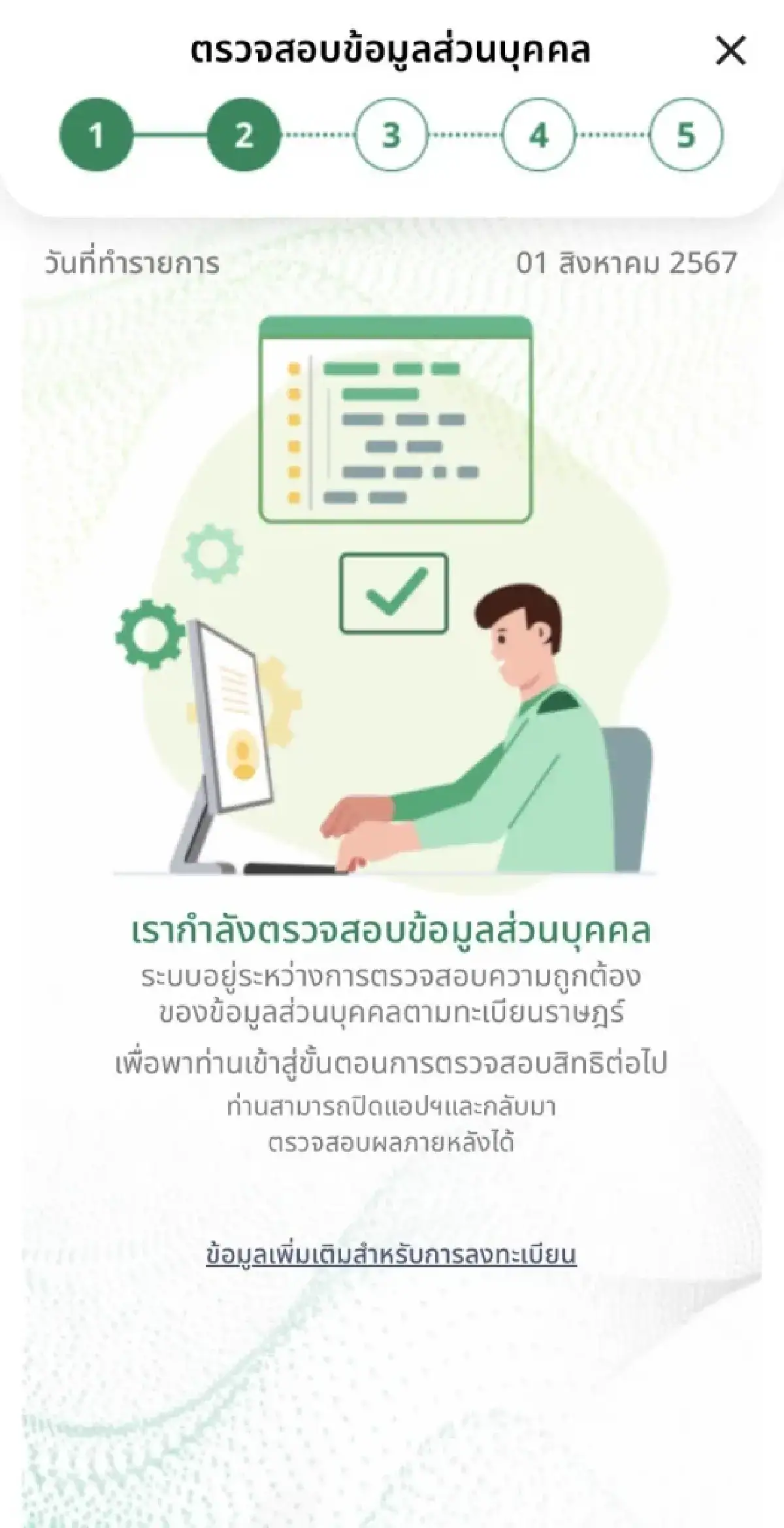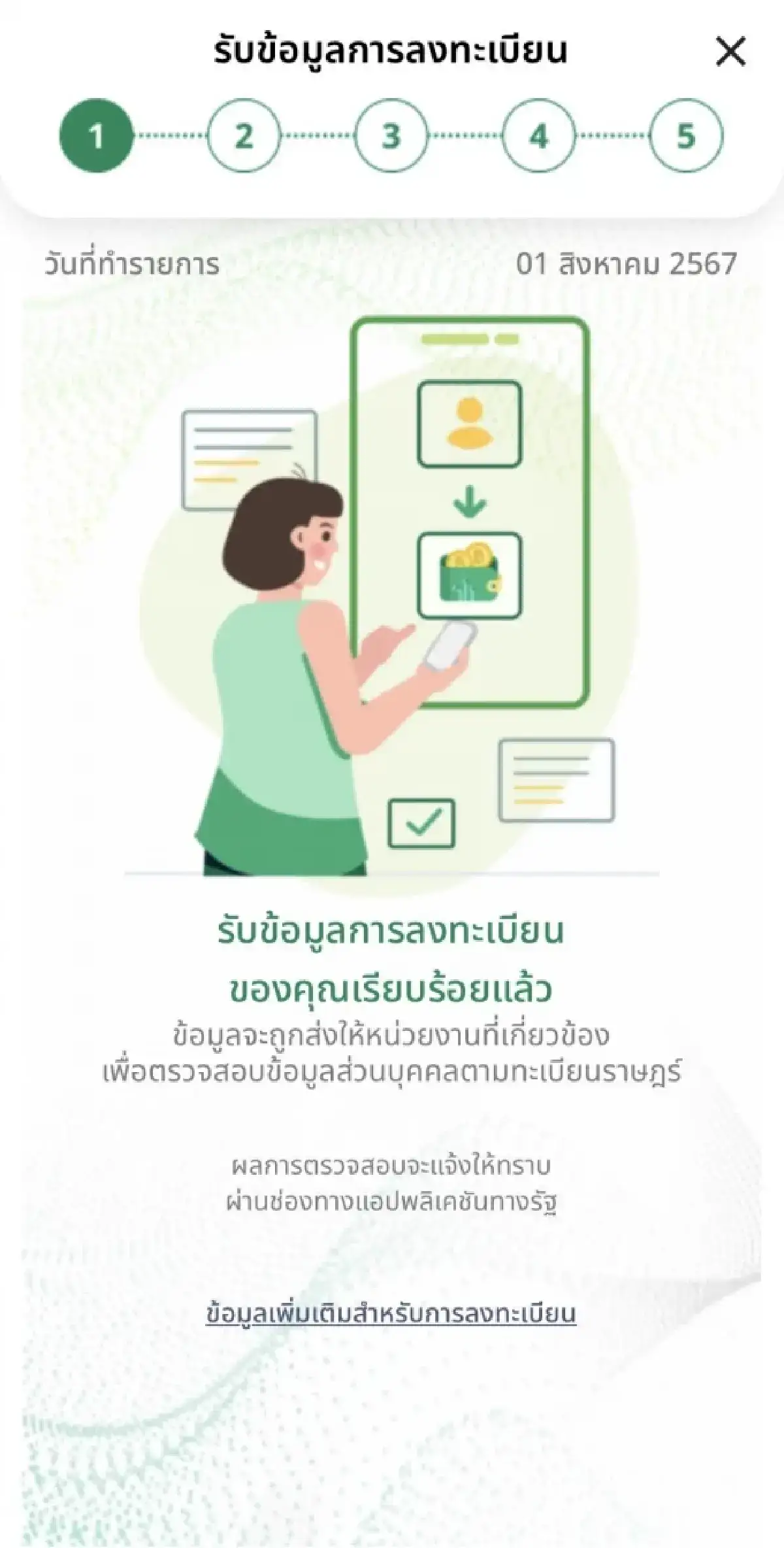 รับข้อมูลการลงทะเบียน ของคุณเรียบร้อยแล้ว ข้อมูลจะถูกส่งให้หน่วยงานที่เกี่ยวข้อง เพื่อตรวจสอบข้อมูลส่วนบุคคลตามทะเบียนราษฎร์ ผลการตรวจสอบจะแจ้งให้ทราบ ผ่านช่องทางแอปพลิเคชันทางรัฐ