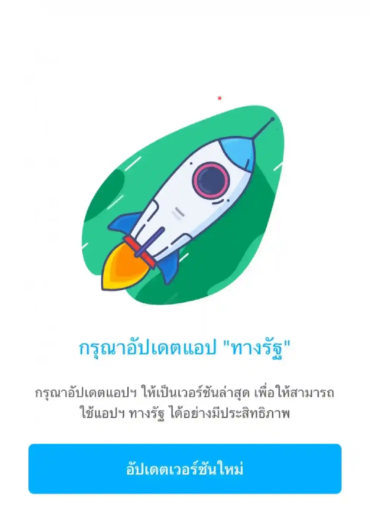 กรุณาอัปเดตแอปทางรัฐ ให้เป็นเวอร์ชันล่าสุด เพื่อให้สามารถใช้แอปทางรัฐได้อย่างมีประสิทธิภาพ พร้อมกับมีแถบข้อความสีฟ้าให้กดที่ข้อความ “อัปเดทเวอร์ชันใหม่”