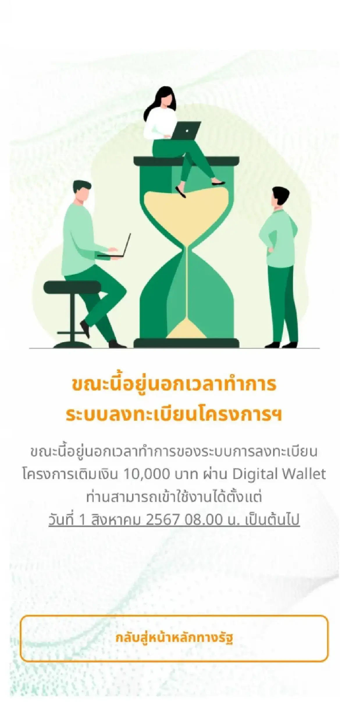 โดยช่วงเช้าก่อนถึงเวลาลงทะเบียนดิจิทัลวอลเล็ต “แอปพลิเคชันทางรัฐ” แจ้งข้อความระบุว่า