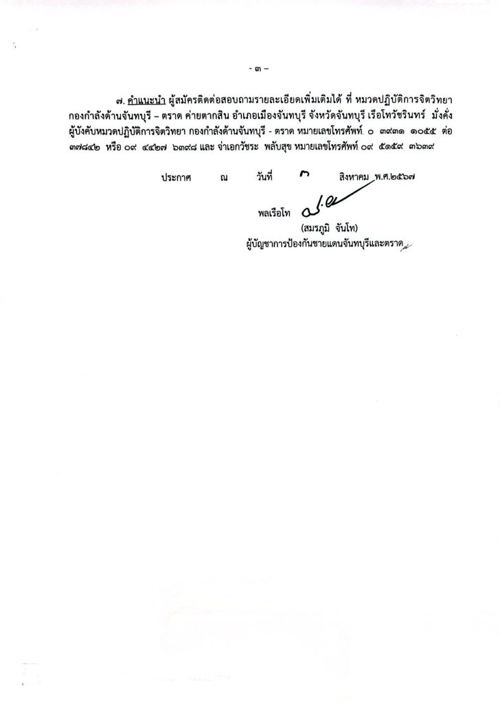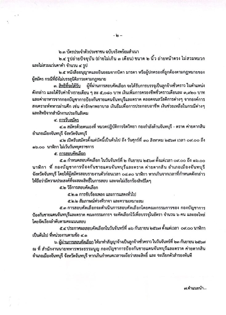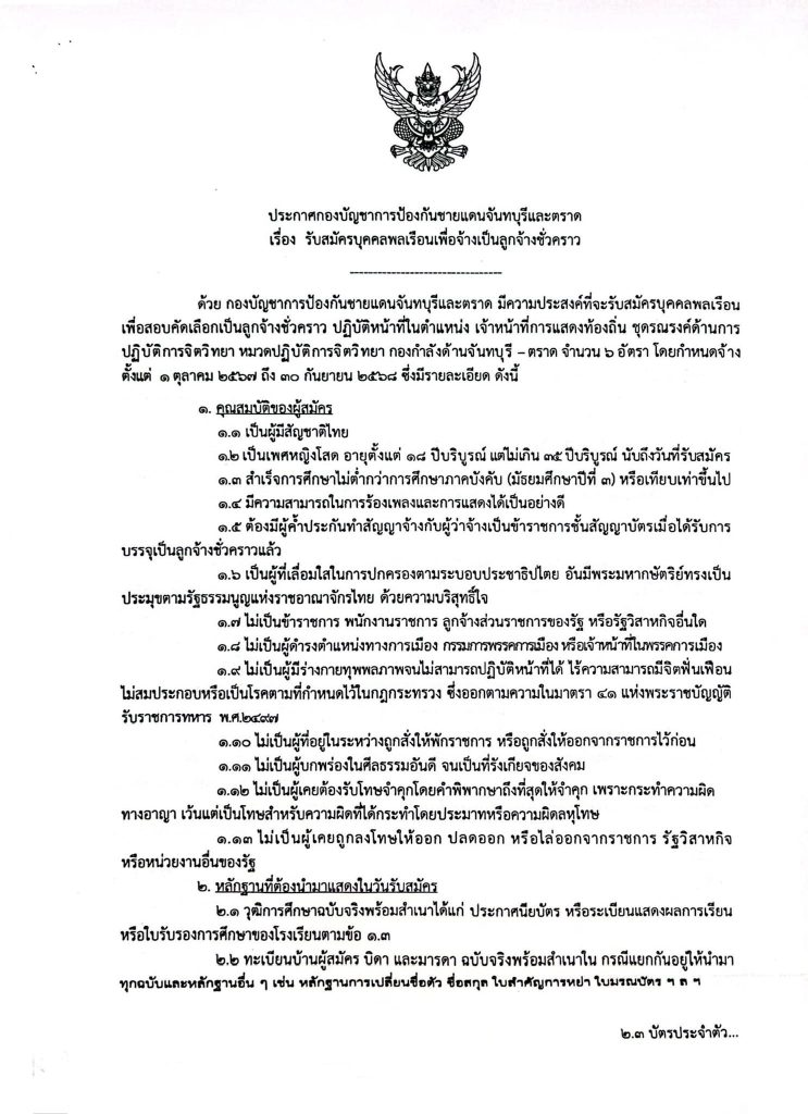 กองบัญชาการป้องกันชายแดนจันทบุรีและตราด เปิดรับสมัครบุคคลพลเรือนเพื่อจ้างเป็นลูกจ้างชั่วคราวในตำแหน่ง เจ้าหน้าที่การแสดงท้องถิ่น 6 อัตรา เพศหญิง โสด อายุ 18-35 ปี วุฒิ ม.3 (ต้องมีบุคคลค้ำประกัน) มีความสามารถในการแสดงและการร้องเพลง สมัครด้วยตนเอง บัดนี้-30ส.ค.67 ไม่เว้นวันหยุดราชการ สอบถามข้อมูลเพิ่มเติมได้ที่ โทร. 095 – 1593639