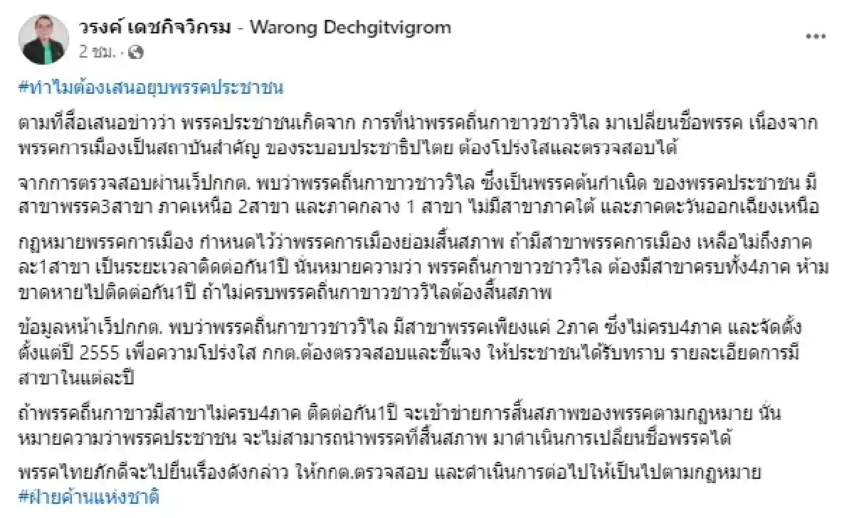 นายแพทย์วรงค์ เดชกิจวิกรม ประธานพรรคไทยภักดี โพสต์ข้อความผ่านเฟซบุ๊กระบุถึงสาเหตุ ทำไมต้องเสนอยุบพรรคประชาชน โดยระบุว่า