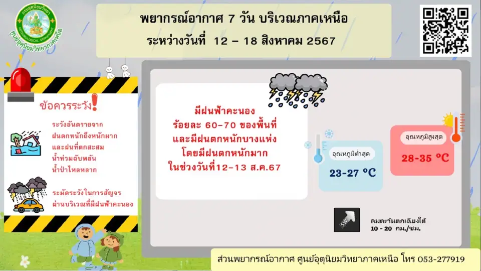 - มีฝนฟ้าคะนองร้อยละ 40 – 60 ของพื้นที่ ส่วนมากในช่วงระหว่างบ่ายถึงค่ำตลอดช่วง และมีฝนตกหนักบางแห่งในช่วงวันที่ 16 – 17 ส.ค. 67อุณหภูมิต่ำสุด 24 – 28 องศาเซลเซียส อุณหภูมิสูงสุด 32 – 36 องศาเซลเซียส ลมตะวันตกเฉียงใต้ ความเร็ว 10 – 20 กม./ชม.