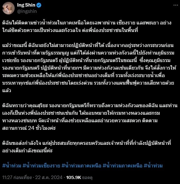 22 ส.ค.2567 – น.ส.แพทองธาร ชินวัตร นายกรัฐมนตรี โพสต์ข้อความผ่านแพลตฟอร์ม X ระบุว่า ดิฉันได้ติดตามข่าวน้ำท่วมในภาคเหนือโดยเฉพาะน่าน เชียงราย และพะเยา อย่างใกล้ชิดด้วยความเป็นห่วงและกังวลใจ ต่อพี่น้องประชาชนในพื้นที่