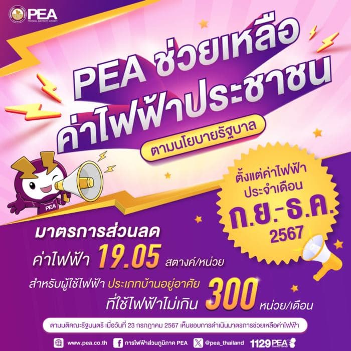 30 ส.ค.67 การไฟฟ้านครหลวง (MEA) และ การไฟฟ้าส่วนภูมิภาค (PEA) มีการลงประกาศแจ้งมาตรการลดค่าไฟฟ้า ตามมติ ครม. เมื่อวันที่ 23 กรกฎาคม ที่ผ่านมา เพื่อช่วยเหลือประชาชนในเรื่องค่าครองชีพและการฟื้นตัวทางเศรษฐกิจ ดังนี้