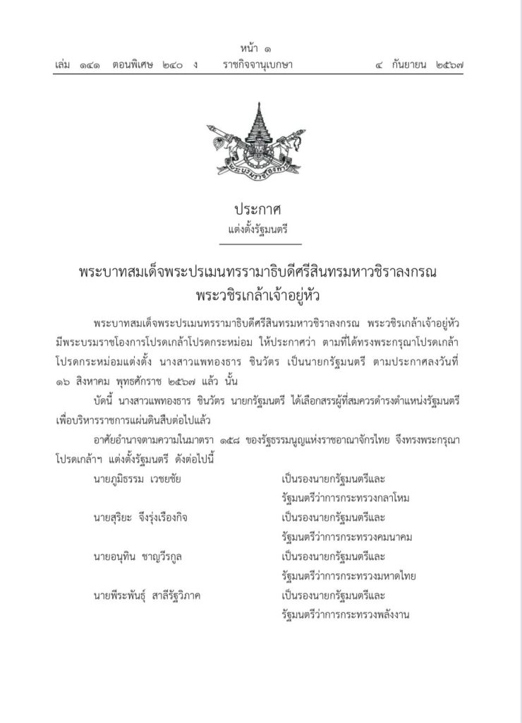 พระบาทสมเด็จพระปรเมนทรรามาธิบดีศรีสินทรมหาวชิราลงกรณ พระวชิรเกล้าเจ้าอยู่หัว มีพระบรมราชโองการโปรดเกล้าโปรดกระหม่อม ให้ประกาศว่า ตามที่ได้ทรงพระกรุณาโปรดเกล้า โปรดกระหม่อมแต่งตั้ง นางสาวแพทองธาร ชินวัตร เป็นนายกรัฐมนตรี ตามประกาศลงวันที่ ๑๖ สิงหาคม พุทธศักราช ๒๕๖๗ แล้ว นั้น