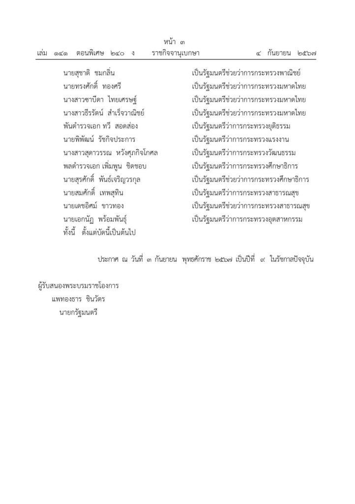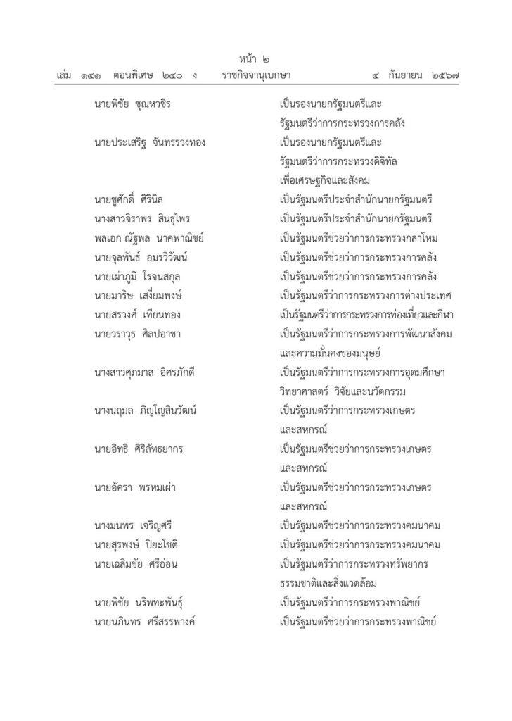 วันที่ ๔ กันยายน ๒๕๖๗ เว็บไซต์ราชกิจจานุเบกษา ได้เผยแพร่ประกาศ แต่งตั้งรัฐมนตรี