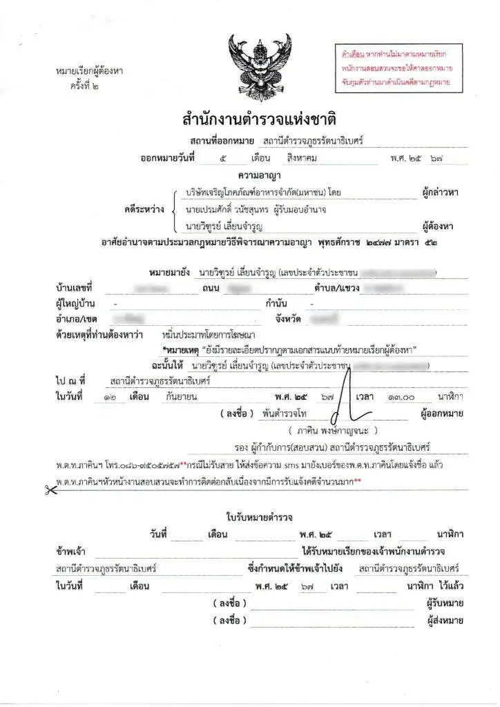 ในหมายเรียกแจ้งให้ผู้ถูกกล่าวหาเดินทางไปที่สถานีตำรวจภูธรรัตนาธิเบศร์ ในวันที่ 12 กันยายน 2567 เวลา 13.00 น.