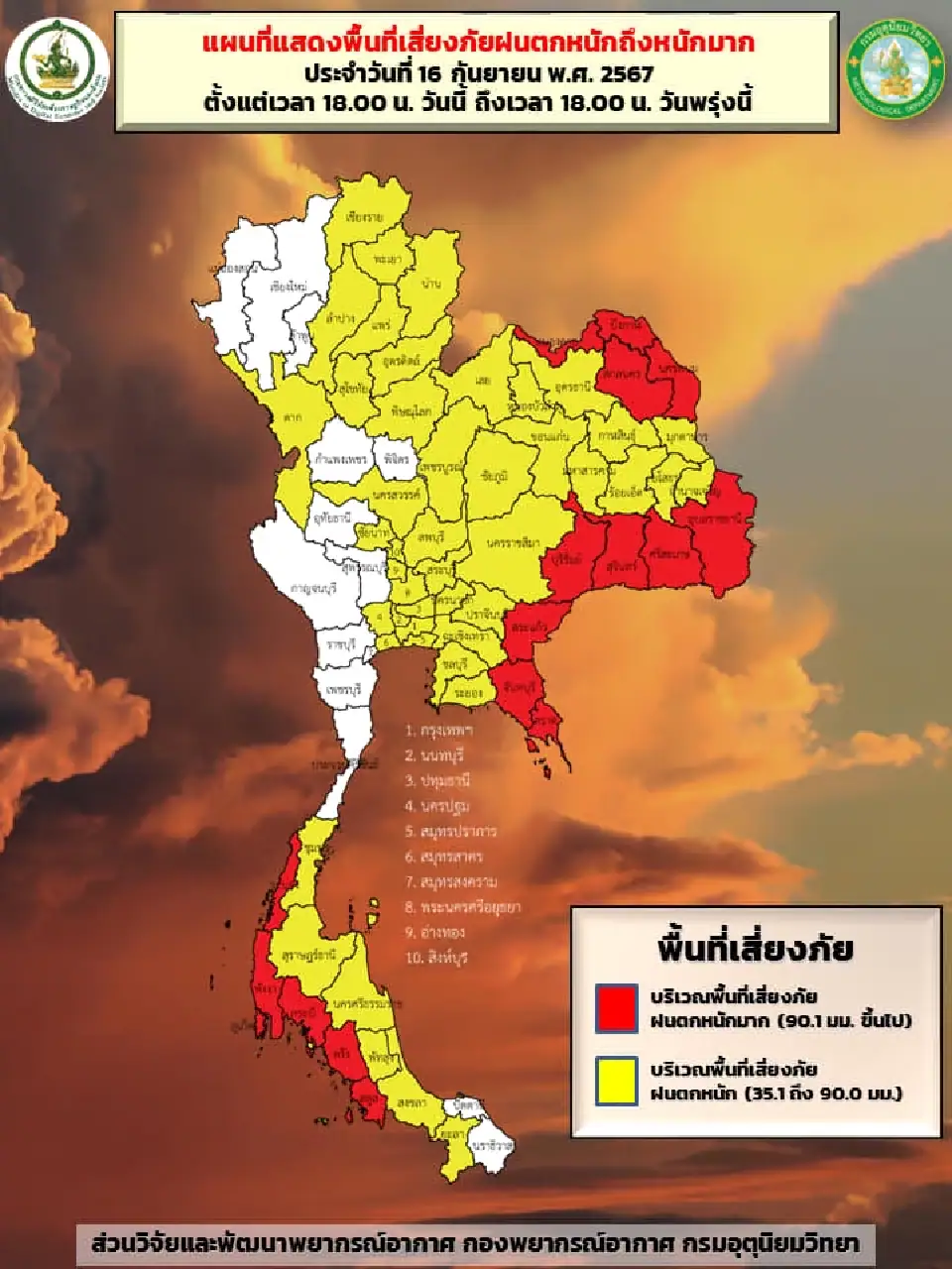 ในช่วงวันที่ 16-17 ก.ย. 67 ประเทศไทยมีฝนตกหนักบางแห่ง โดยมีฝนตกหนักมากบางพื้นที่ ในภาคตะวันออกเฉียงเหนือ ภาคกลาง ภาคตะวันออก และภาคใต้ฝั่งตะวันตก ขอให้ประชาชนในบริเวณดังกล่าวระวังอันตรายจากฝนตกหนักถึงหนักมากและฝนที่ตกสะสม ซึ่งอาจทำให้เกิดน้ำท่วมฉับพลันและน้ำป่าไหลหลาก โดยเฉพาะพื้นที่ลาดเชิงเขา ใกล้ทางน้ำไหลผ่าน และพื้นที่ลุ่มไว้ด้วย