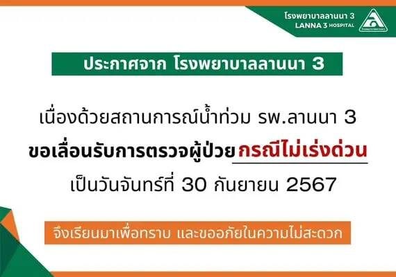 ล่าสุด ผู้สื่อข่าวรายงานว่า โรงพยาบาลลานนา 3 ประกาศ เลื่อนรับผู้ป่วย ระบุว่า “ประกาศจากโรงพยาบาลลานนา 3 เนื่องด้วยสถานการณ์น้ำท่วม รพ.ลานนา 3ขอเลื่อนรับการตรวจผู้ป่วย กรณีไม่เร่งด่วน เป็นวันจันทร์ที่ 30 กันยายน 2567 จึงเรียนมาเพื่อทราบ และขออภัยในความไม่สะดวก”