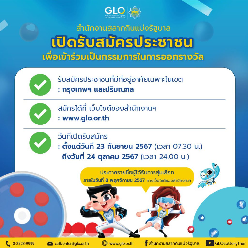 23 ก.ย.67 สำนักงานสลากกินแบ่งรัฐบาล เปิดรับสมัครประชาชนเพื่อเข้าร่วมเป็นกรรมการในการออกรางวัล โดยเปิดรับสมัครประชาชนที่มีที่อยู่อาศัยเฉพาะในเขตกรุงเทพฯ และปริมณฑล ให้เข้าร่วมเป็นกรรมการออกรางวัล งวดละ 1 ท่าน