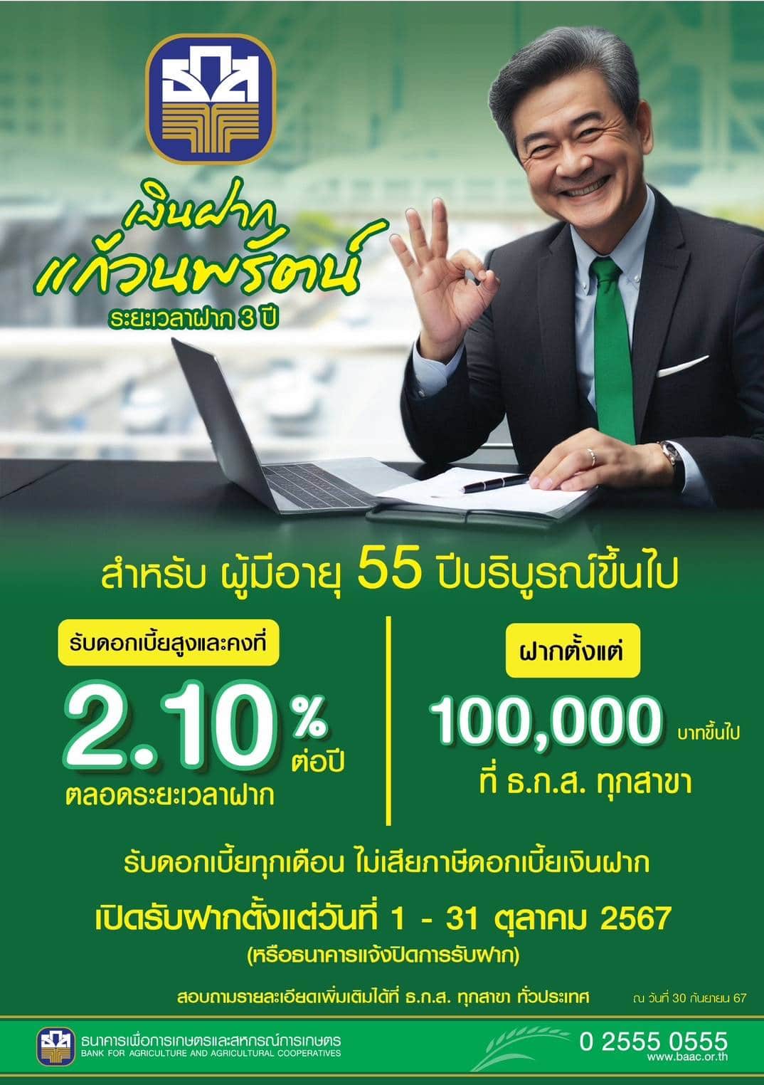 2 ตุลาคม 2567 นายฉัตรชัย ศิริไล ผู้จัดการธนาคารเพื่อการเกษตรและสหกรณ์การเกษตร (ธ.ก.ส.) กล่าวว่า ธ.ก.ส. จัด 2 โครงการเงินฝากวัยเลอค่า ประกอบด้วย