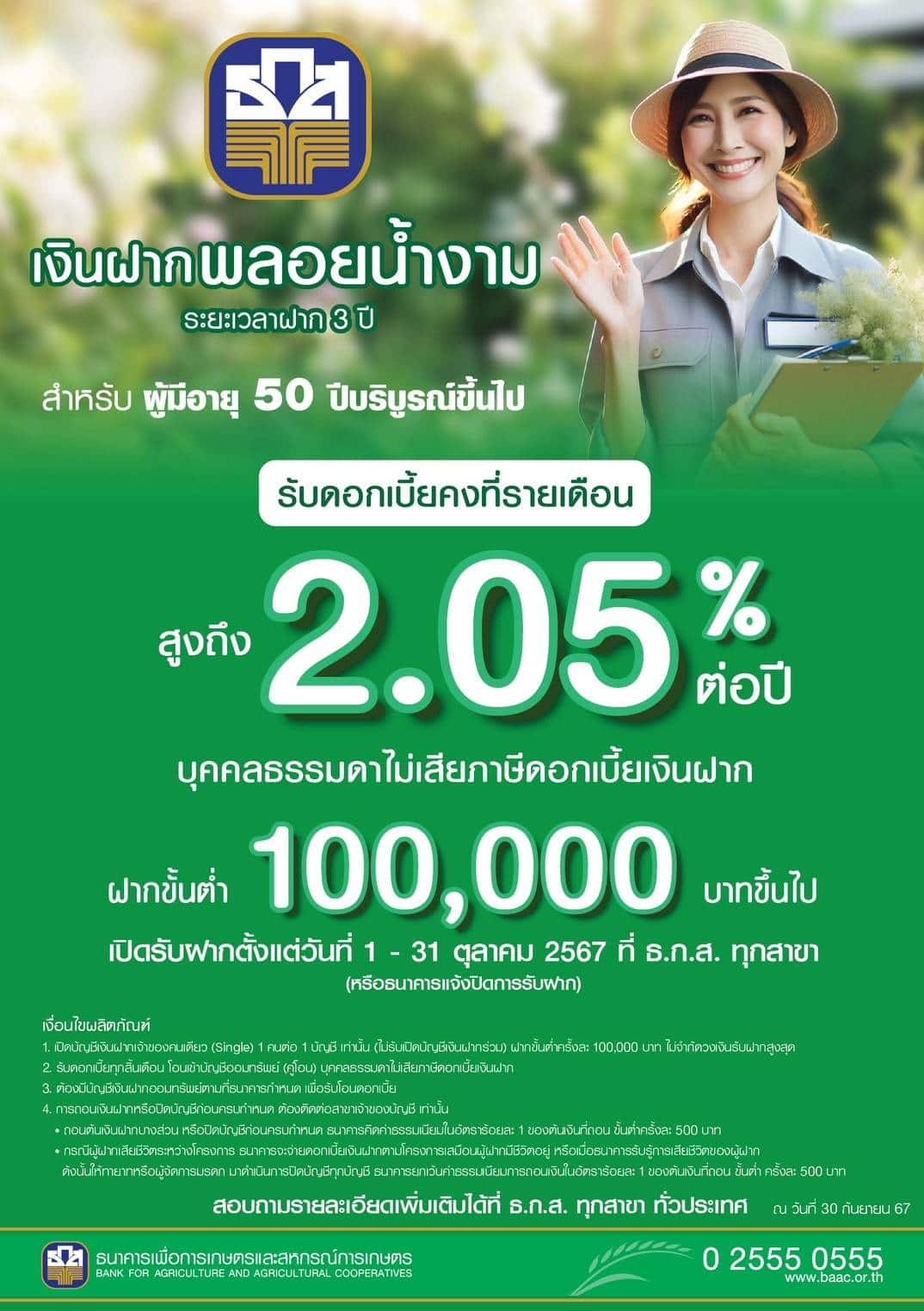 สำหรับท่านที่สนใจ รวมถึงลูกค้าโครงการเงินฝาก “Happy Senior” ที่ครบกำหนดสามารถติดต่อสาขา เพื่อแสดงความประสงค์เปิดบัญชีเงินฝากหรือฝากต่อโครงการ ตั้งแต่วันนี้ ถึง 31 ตุลาคม 2567 หรือธนาคารรับฝากเต็มวงเงิน สอบถามรายละเอียดเพิ่มเติมได้ที่ ธ.ก.ส. ทุกสาขาทั่วประเทศ www.baac.or.th หรือ Call Center 0-2555-0555