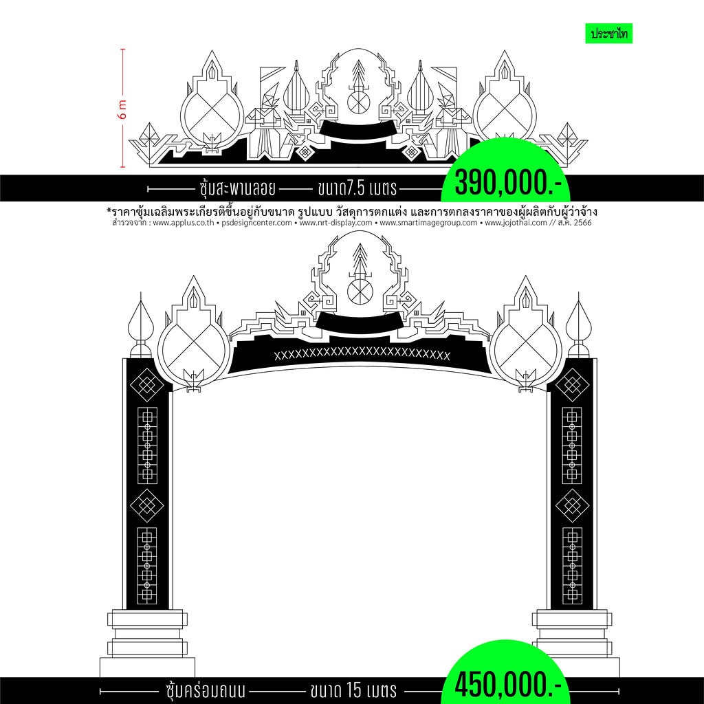 ซึ่งหากเป็นซุ้มสะพายลอยราคาเริ่มต้น 3.9 แสนบาท ซุ้มคร่อมถนน ราคาเริ่มต้น 4.5 แสนบาท (คลิกอ่านเพิ่มเติม : https://prachatai.com/journal/2023/08/105425 )