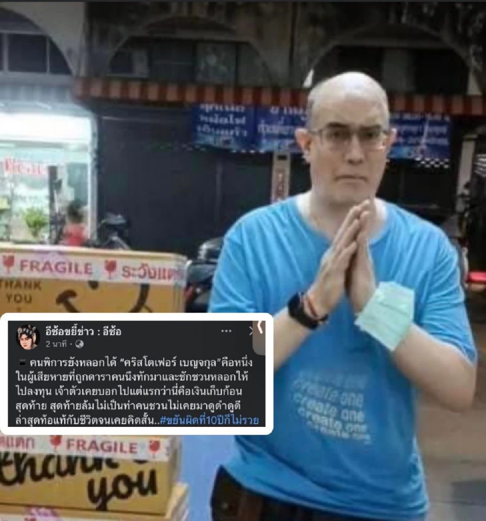 “คนพิการยังหลอกได้ คริสโตเฟอร์ เบญจกุล คือหนึ่งในผู้เสียหายที่ถูกดาราคนนึงทักมา และชักชวนหลอกให้ไปลงทุน เจ้าตัวเคยบอกไปแต่แรกว่า นี่คือเงินเก็บก้อนสุดท้าย สุดท้ายล้มไม่เป็นท่าคนชวนไม่เคยมาดูดำดูดี ล่าสุด ท้อแท้กับชีวิตจนเคยคิดสั้น คงมีอีกเยอะที่ไม่กล้าออกมา”