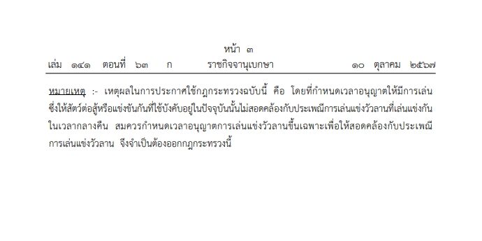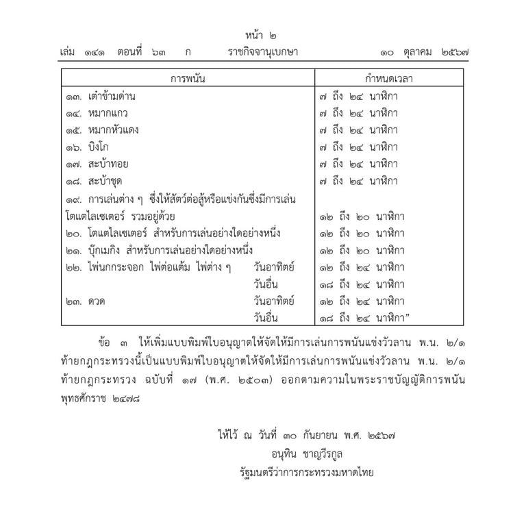 11 ต.ค.67 ราชกิจจานุเบกษา เผยแพร่ กฎกระทรวง ฉบับที่ 46 ให้การพนันต่อไปนี้ ให้เล่นได้ภายในกำหนดเวลา จำนวน 23 ชนิด อาทิ วิ่งวัวคน เวลา 7-19 น. , ชกมวย มวยปล้ำ 12-24 น. , โยนห่วง 7-24 น. และ ไพ่นกกระจอก ไพ่ต่อแต้ม ไพ่ต่างๆ วันอาทิตย์ 12-24 น. วันอื่น 18-24 น.