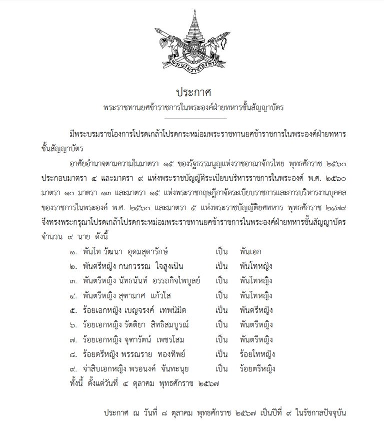 11 ต.ค. 2567 ราชกิจจานุเบกษาประการ มีพระบรมราชโองการโปรดเกล้าฯ แต่งตั้งข้าราชการในพระองค์ฝ่ายทหารชั้นสัญญาบัตร 9 ราย ดังนี้
