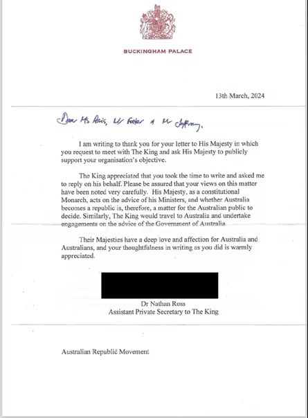 จดหมายจากพระราชวังซึ่งเป็นพระราชสาส์นของกษัตริย์ชาร์ลส์ระบุว่า “การที่ออสเตรเลียจะกลายเป็นสาธารณรัฐหรือไม่นั้น เป็นเรื่องที่ประชาชนชาวออสเตรเลียจะตัดสินใจ”