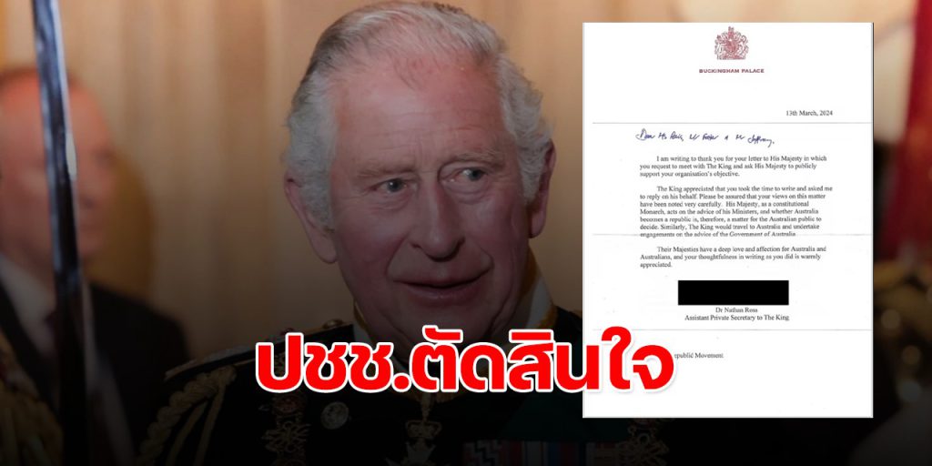 13 ต.ค.67 มติชนออนไลน์ รายงานว่า กษัตริย์ชาร์ลส์ที่ 3 แห่งสหราชอาณาจักร ทรงยืนยันว่า ประชาชนชาวออสเตรเลีย จะต้องเป็นผู้ตัดสินใจว่า ออสเตรเลียจะยังคงเป็นประเทศที่ปกครองด้วยระบอบประชาธิปไตยอันมีพระมหากษัตริย์ทรงเป็นประมุข หรือจะเปลี่ยนไปปกครองในฐานะสาธารณรัฐ