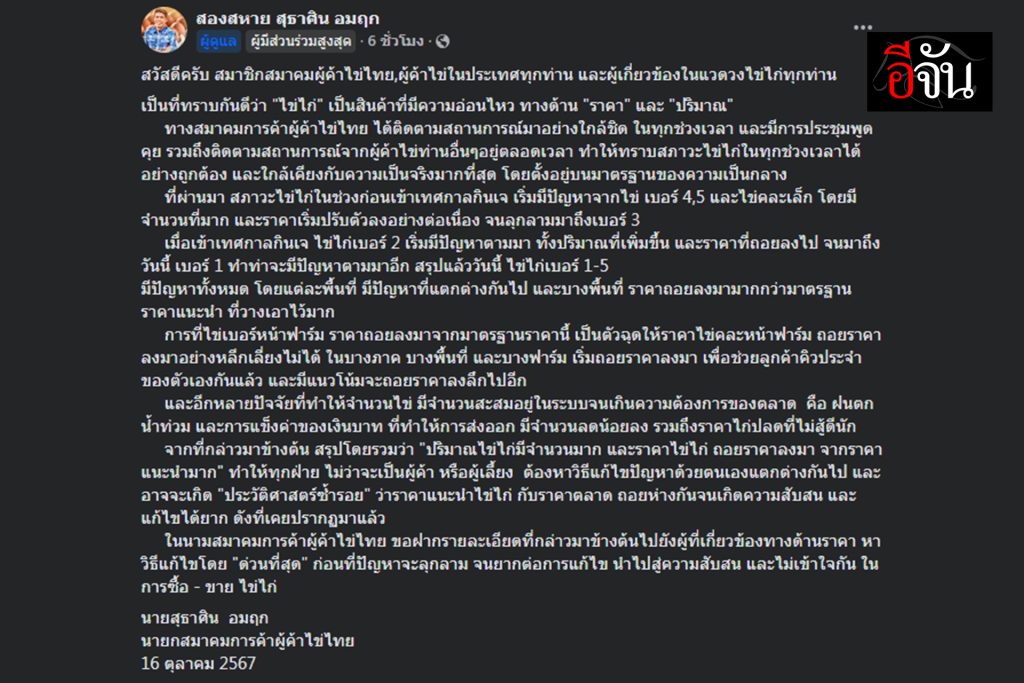 ล่าสุด นายสธาศิน อมฤก นายกสมาคมการค้าผู้ค้าไข่ไทย ได้แจ้งข่าว ให้ผู้ค้าและผู้เลี้ยงได้รับทราบ ถึงสภาวะไข่ไก่ในตอนนี้ ในช่วงเทศกาลกินเจ มีปัญหามาจากไข่ไก่ เบอร์ 4-5 และไข่คละไซซ์เล็ก ที่มีจำนวนมากขึ้น บวกกับราคา ที่ปรับตัวลงอย่างต่อเนื่อง จนลุกลามไปถึงเบอร์ 3 เมื่อเข้าเทศกาลกินเจ ไข่ไก่เบอร์ 2 เริ่มมีปัญหาตามมา ทั้งปริมาณที่เพิ่มขึ้น และราคาที่ถอยลงไป วันนี้ เบอร์ 1 ทำท่าจะมีปัญหาตามมาอีก