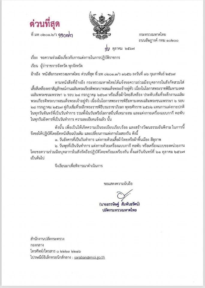 ตามหนังสือที่อ้างถึง กระทรวงมหาดไทยได้แจ้งขอความร่วมมือบุคลากรในสังกัดสวมใส่เสื้อสีเหลืองตราสัญลักษณ์งานเฉลิมพระเกียรติพระบาทสมเด็จพระเจ้าอยู่หัว เนื่องในโอกาสพระราชพิธีมหามงคลเฉลิมพระชนมพรรษา 6 รอบ 28 กรกฎาคม 2567 หรือเสื้อผ้าไทยสีเหลือง ประดับเข็มที่ระลึกงานเฉลิมพระเกียรติพระบาทสมเด็จพระเจ้าอยู่หัว เนื่องในโอกาสพระราชพิพิธีมหามงคลเฉลิมพระชนมพรรษา 6 รอบ 28 กรกฎาคม 25667 คู่กับเข็มที่ระลึกพระราชพิธีบรมรมราชาภิเษก พุทธศักราช 2562 แทนการแต่งกายปกติ ในทุกวันจันทร์ที่เป็นวันทำการ รวมทั้งในวันหรือโอกาสอื่นที่เหมาะสม และแต่งกายเครื่องแบบกากี คอพับ ในทุกวันอังคารที่เป็นวันทำการ ความละเอียดแจ้งแล้ว นั้น