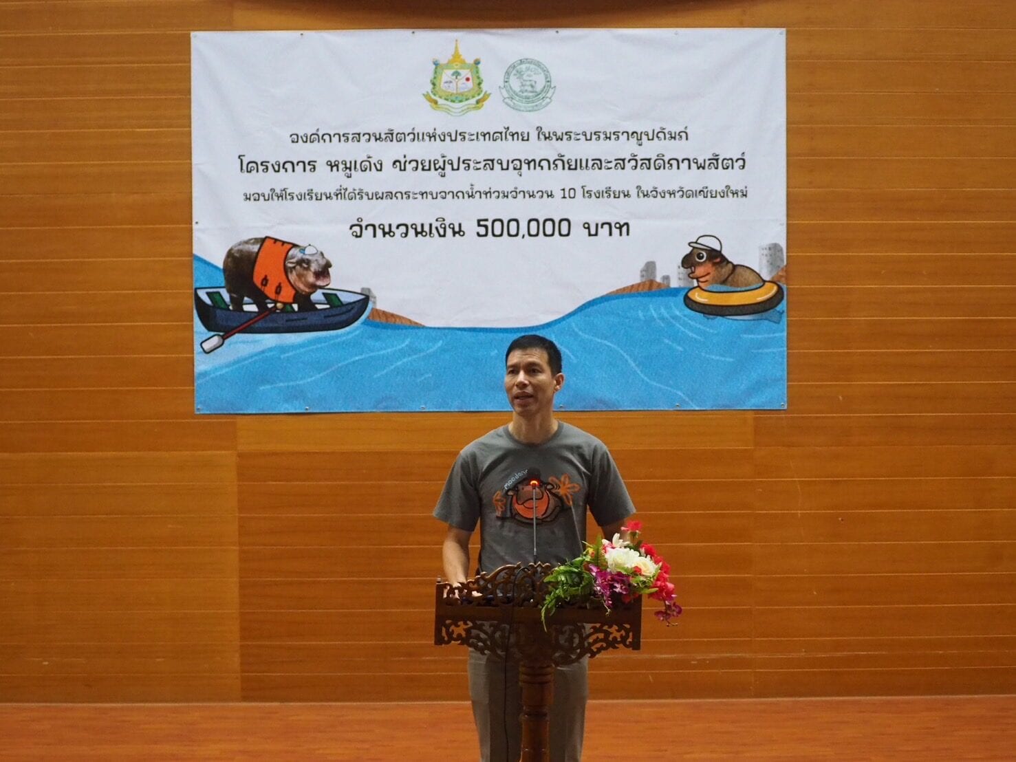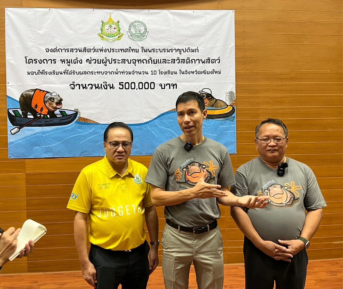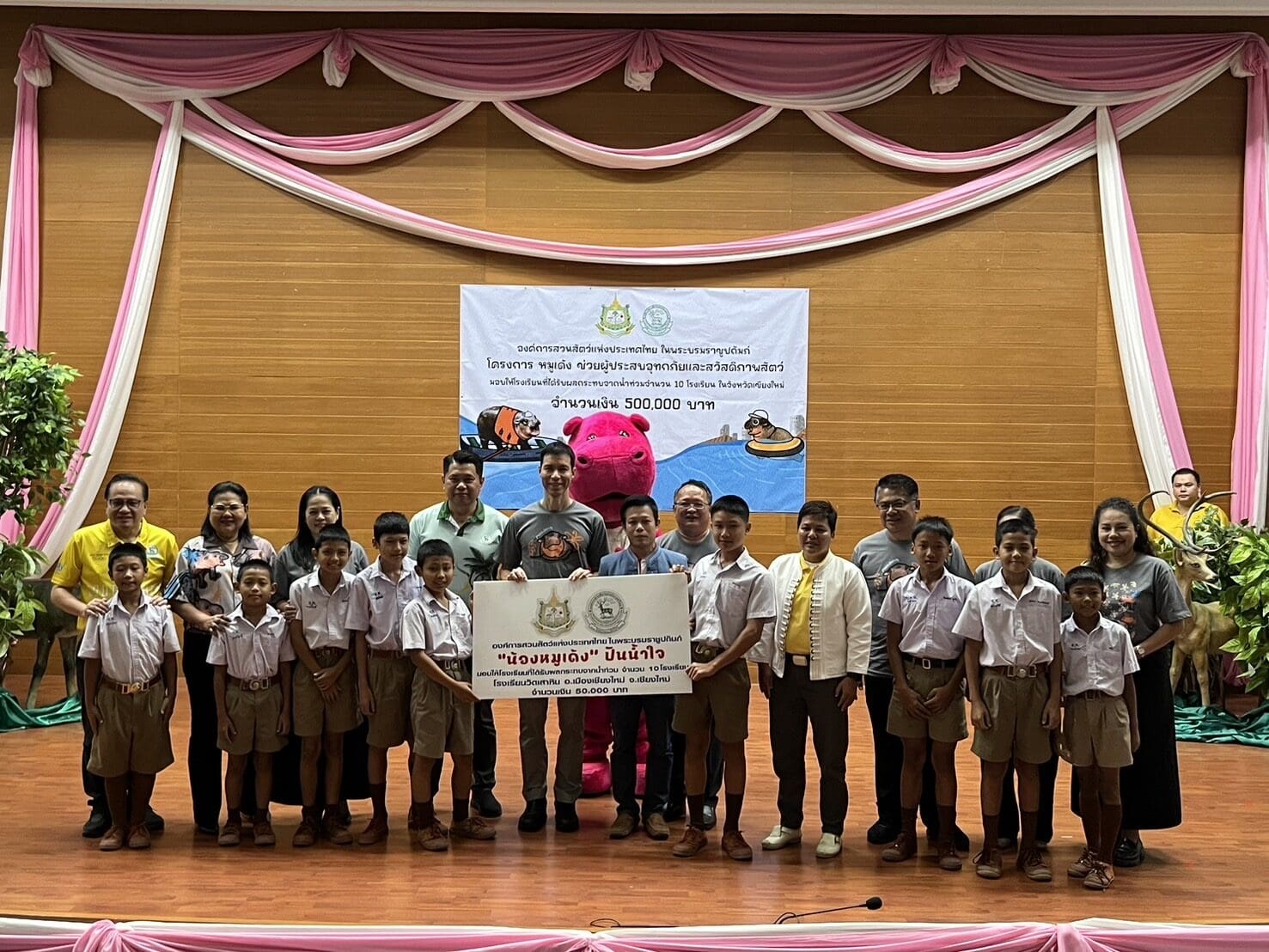 19 ตุลาคม 2567 ที่ห้องประชุมชั้น 5 สวนสัตว์เชียงใหม่ รศ.ดร.เจษฎ์ โทณะณิก ประธานกรรมการองค์การสวนสัตว์แห่งประเทศไทย นายภัทร คำพิทักษ์ กรรมการองค์การสวนสัตว์แห่งประเทศไทย นายอรรภพร ศรีเหรัญ ผู้อำนวยการองค์การสวนสัตว์แห่งประเทศไทย นายวุฒิชัย ม่วงมัน ผู้อำนวยการสวนสัตว์เชียงใหม่ และนายนที ดำรงค์ นายกเทศมนตรีเทศบาลตำบลสันทรายหลวง ร่วมในพิธีมอบเงินช่วยเหลือโรงเรียนที่ประสบอุทกภัยในจังหวัดเชียงใหม่ ตามโครงการ หมูเด้ง ชวนช่วยผู้ประสบอุทกภัยและดูแลสวัสดิภาพเพื่อนสัตว์ ซึ่งในวันนี้มี 10 โรงเรียนที่ประสบภัยหนักที่สุดเดินทางมารับทุนรายละ 50,000 บาท รวม 500,000 บาท สร้างความดีใจแก่คณะครูและนักเรียนที่เดินทางมาร่วมรับความช่วยเหนือเป็นอย่างมาก