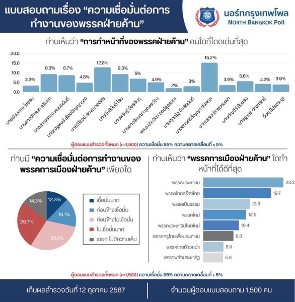 28 ต.ค.67 ผศ.ดร.สานิต ศิริวิศิษฐ์กุล หัวหน้าศูนย์สำรวจความคิดเห็น นอร์ทกรุงเทพโพล มหาวิทยาลัยนอร์มกรุงเทพ เปิดเผยว่า จากการสำรวจความคิดเห็นของประชาชน จำนวน 1,500 คน จากทั่วทุกภูมิภาค ช่วงวันที่ 11-12 ตุลาคม 2567 โดยได้สอบถามถึงประเด็น “ความเชื่อมั่นต่อการทำงานของพรรคฝ่ายค้าน”