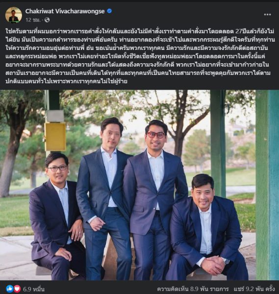 ท่านอ้น-วัชรเรศร วิวัชรวงศ์ เผยภาพล่าสุดกับ “ท่านอ้วน จุฑาวัชร วิวัชรวงศ์” และ “ท่านอินทร์ วัชรวีร์ วิวัชรวงศ์” ผ่านเฟซบุ๊ก Vacharaesorn Vivacharawongse เมื่อวันที่ 27 ต.ค.67 ที่ผ่านมาโดยระบุข้อความว่า