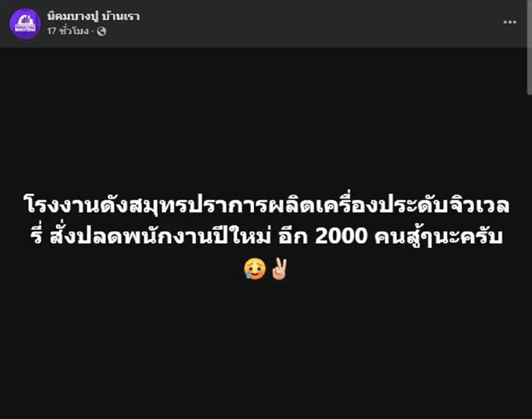 โดยทางด้าน นิคมบางปู บ้านเรา ออกมาเผยว่า “โรงงานดังสมุทรปราการผลิตเครื่องประดับจิวเวลรี่ สั่งปลดพนักงานปีใหม่ อีก 2000 คน” และทางเพจยังได้ให้กำลังใจพนักงานที่กำลังจะตกงานช่วงปีใหม่