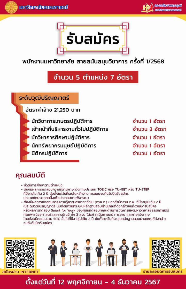 มหาวิทยาลัยธรรมศาสตร์ รับสมัครพนักงานมหาวิทยาลัย สายสนับสนุนวิชาการ วุฒิ ป.ตรี เงินเดือน 21,250 บาท เปิดรับสมัครผ่านอินเทอร์เน็ต 12พ.ย.-4ธ.ค.67 รายละเอียดเพิ่มเติมสแกนอ่านได้ตาม QR Code ในโปสเตอร์ด้านล่างนี้