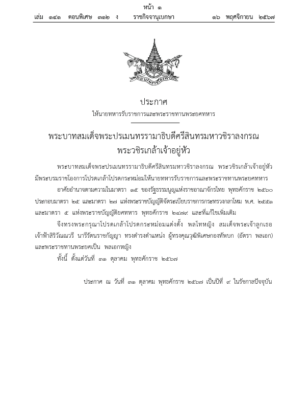 16 พ.ย.67 ราชกิจจานุเบกษา เผยแพร่ พระบรมราชโองการ ประกาศ ให้นายทหารรับราชการและพระราชทานพระยศทหาร
