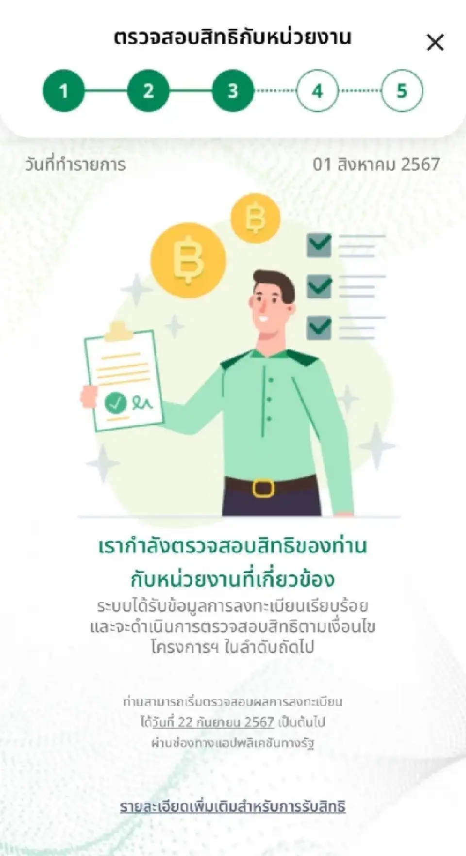 หากอยู่ในขั้นตอนที่ 3 คือ ระบบอยู่ระหว่างการตรวจสอบสิทธิ หากพบสถานะนี้ แสดงว่าระบบกำลังดำลังดำเนินการตรวจสอง สิทธิของท่าน โปรดรอสักครู่แล้วตรวจสอบอีกครั้งในภายหลัง