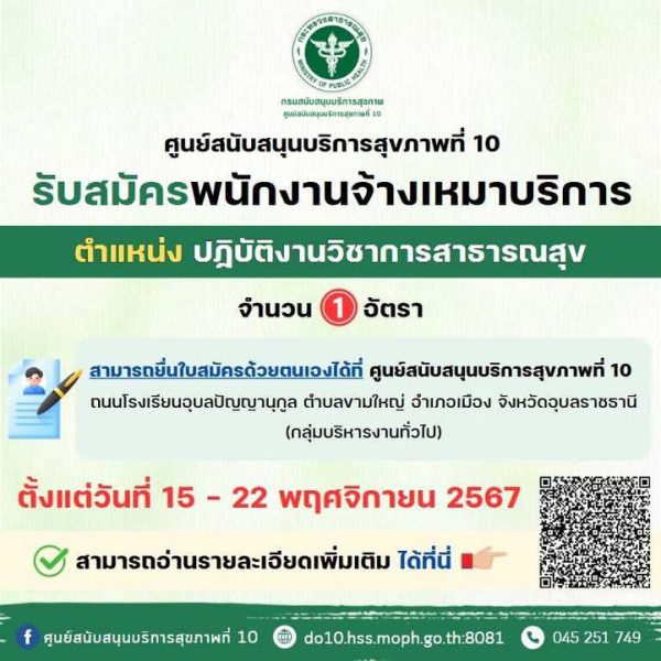 ศูนย์สนับสนุนบริการสุขภาพที่ 10 รับสมัครพนักงานจ้างเหมาบริการ ปฏิบัติงานวิชาการสาธารณสุข วุฒิ ป.ตรี ไม่ต้องผ่าน ก.พ. สมัครด้วยตนเอง บัดนี้-22 พ.ย.67 ((คลิกทีนี่เพื่ออ่านรายละเอียดเพิ่มเติม/ดาวน์โหลดเอกสารประกาศฉบับเต็ม))