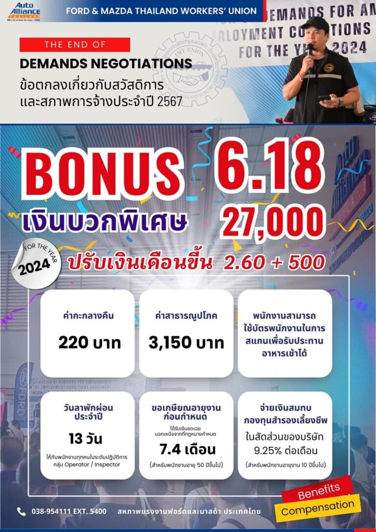 ผู้สื่อข่าวรายงานว่า เฟซบุ๊ก สหภาพแรงงาน ฟอร์ดและมาสด้า เปิดเผยเงินโบนัสของ บริษัท ออโต้อัลลายแอนซ์ (ประเทศไทย) จำกัด ระบุว่า “สำหรับพนักงานของบริษัทออโต้อัลลายแอนซ์ (ประเทศไทย) จำกัด โดยมีรายละเอียดดังนี้ โบนัส 6.18 เท่าของเงินเดือน พร้อมเงินบวกพิเศษ 27,000 บาท