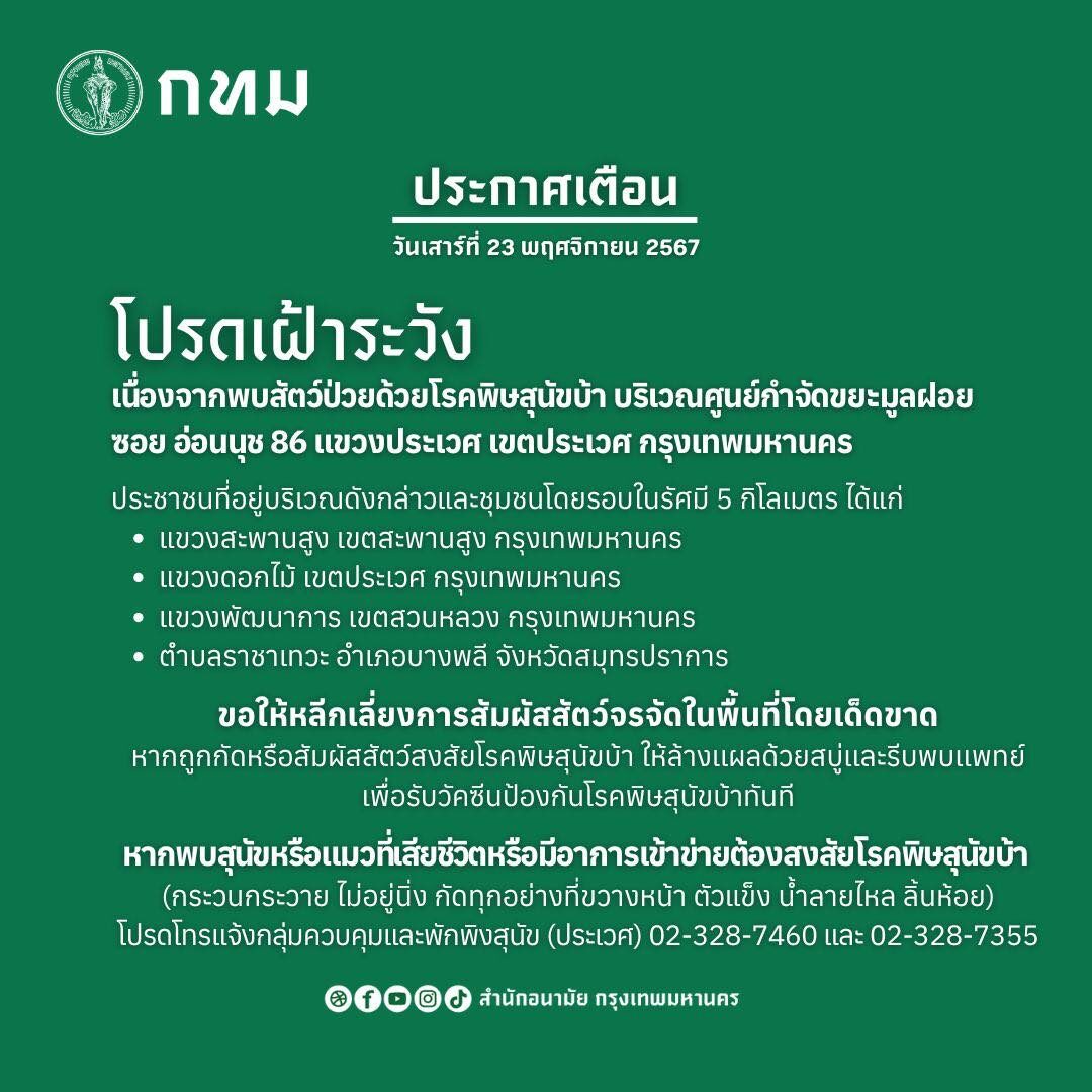 23 พฤศจิกายนที่ผ่านมา สำนักอนามัย กรุงเทพมหานคร ออกแจ้งเตือนถึงประชาชนว่า มีการ พบสัตว์ป่วยด้วยโรคพิษสุนัขบ้า บริเวณศูนย์กำจัดขยะมูลฝอย ซอยอ่อนนุช 86 แขวงประเวศ เขตประเวศ กรุงเทพมหานคร