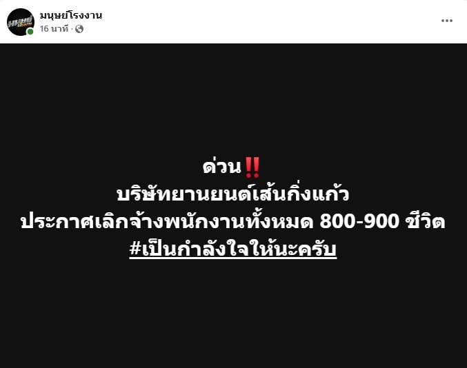 โดยเพจ มนุษย์โรงงาน โพสต์ข้อความว่า “ด่วน บริษัทยานยนต์เส้นกิ่งแก้ว ประกาศเลิกจ้างพนักงานทั้งหมด 800-900 ชีวิต #เป็นกำลังใจให้นะครับ”