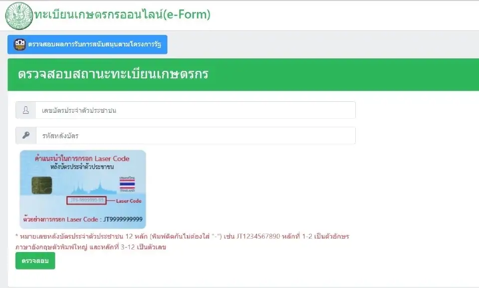 - หากผู้ที่ไม่ใช่เกษตรกร ตรวจสอบระบบจะขึ้นข้อมูลว่า ไม่พบข้อมูลการลงทะเบียน (โปรดติดต่อหน่วยงานที่รับขึ้นทะเบียนเกษตรกรตามชนิดพืชที่ได้รับสิทธิตามโครงการ)