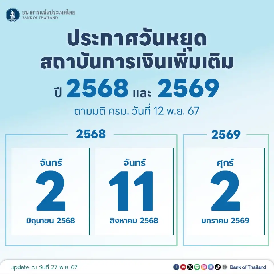 - วันจันทร์ 30 ธันวาคม 2567 วันหยุดราชการเพิ่มเป็นกรณีพิเศษ ตามมติคณะรัฐมนตรี